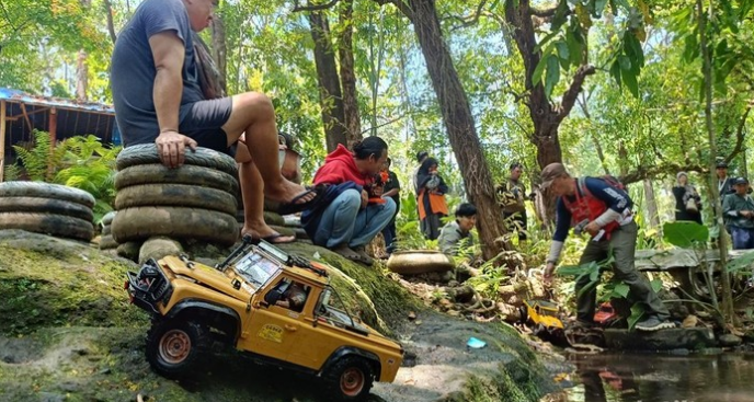 Di sini, ketangkasan mutlak diperlukan. Salah perhitungan sedikit, mobil bisa terjungkal atau tersangkut di antara celah batu. Tantangan berlanjut ke jalur berlumpur di tepi sungai. Roda-roda kecil itu berputar kencang, melemparkan cipratan lumpur ke segala penjuru. Saat salah satu mobil terperosok, mobil lain segera mendekat untuk “menolong” dengan menggunakan winch (tali penarik), persis seperti yang dilakukan komunitas off-road pada dunia nyata.